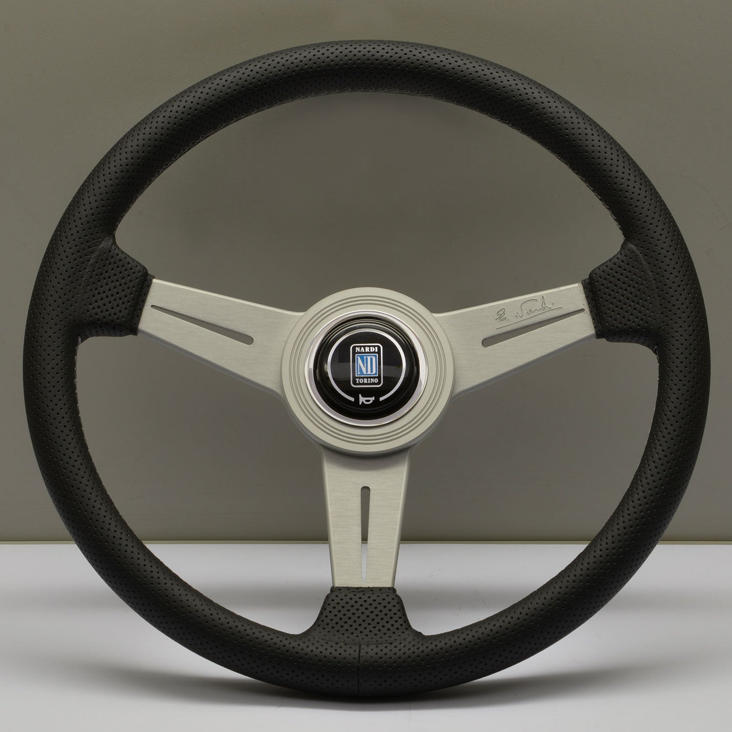 Nardi Classic ND34 Steering Wheel Black Perforated Leather Satin Spokes Grey Stitching 25 mm Dish SpecificationsNardi products are extremely prestigious and represent for many the ultimate finish to the interior of a race collection or prestige car. Italian hand made with excellent quality materials they enjoy an exemplary finish and are acclaimed worldwide. Many car manufacturers collaborate (or have collaborated) with Nardi to equip their vehicles from the factory as standard : Ferrari Lancia Audi Maserati Lamborghini Pagani Rolls Royce Jaguar Lotus TVR McLaren Mazda Volkswagen Abarth or BMW